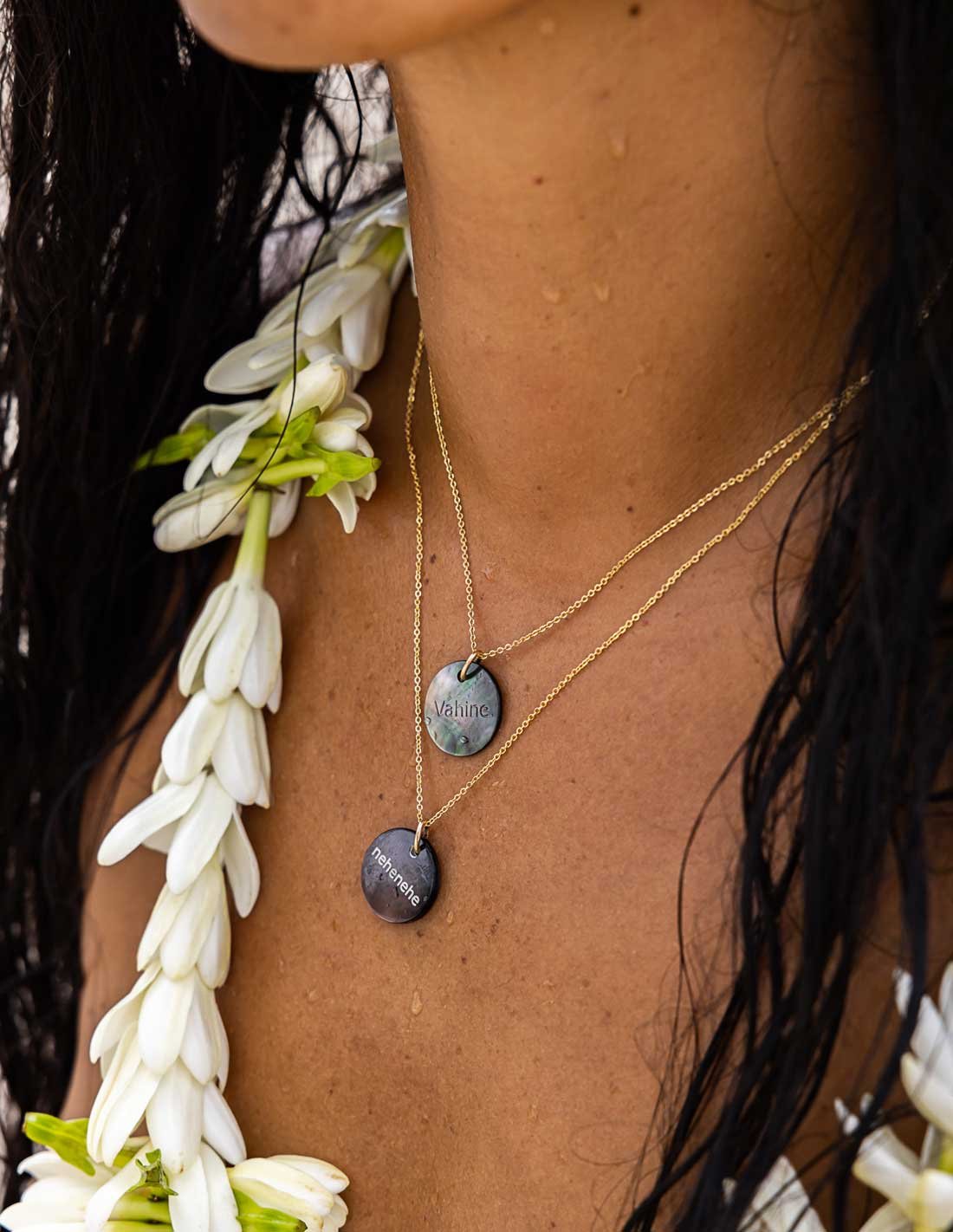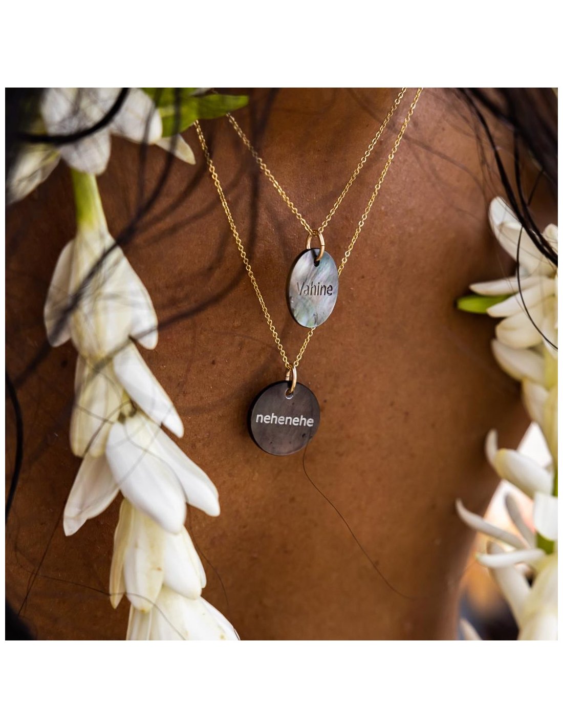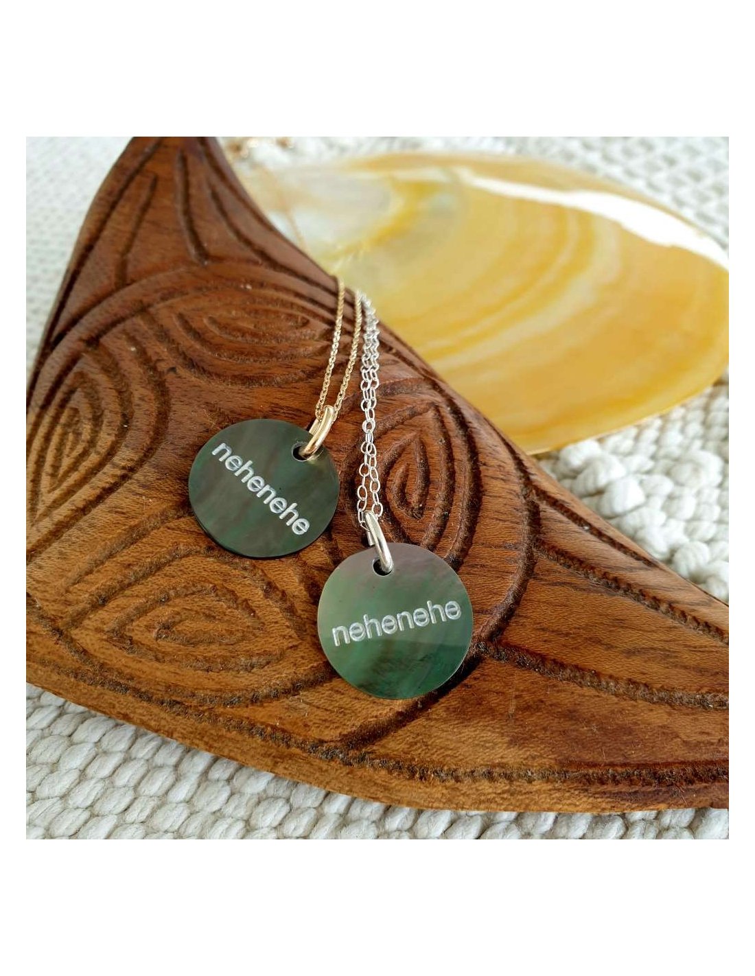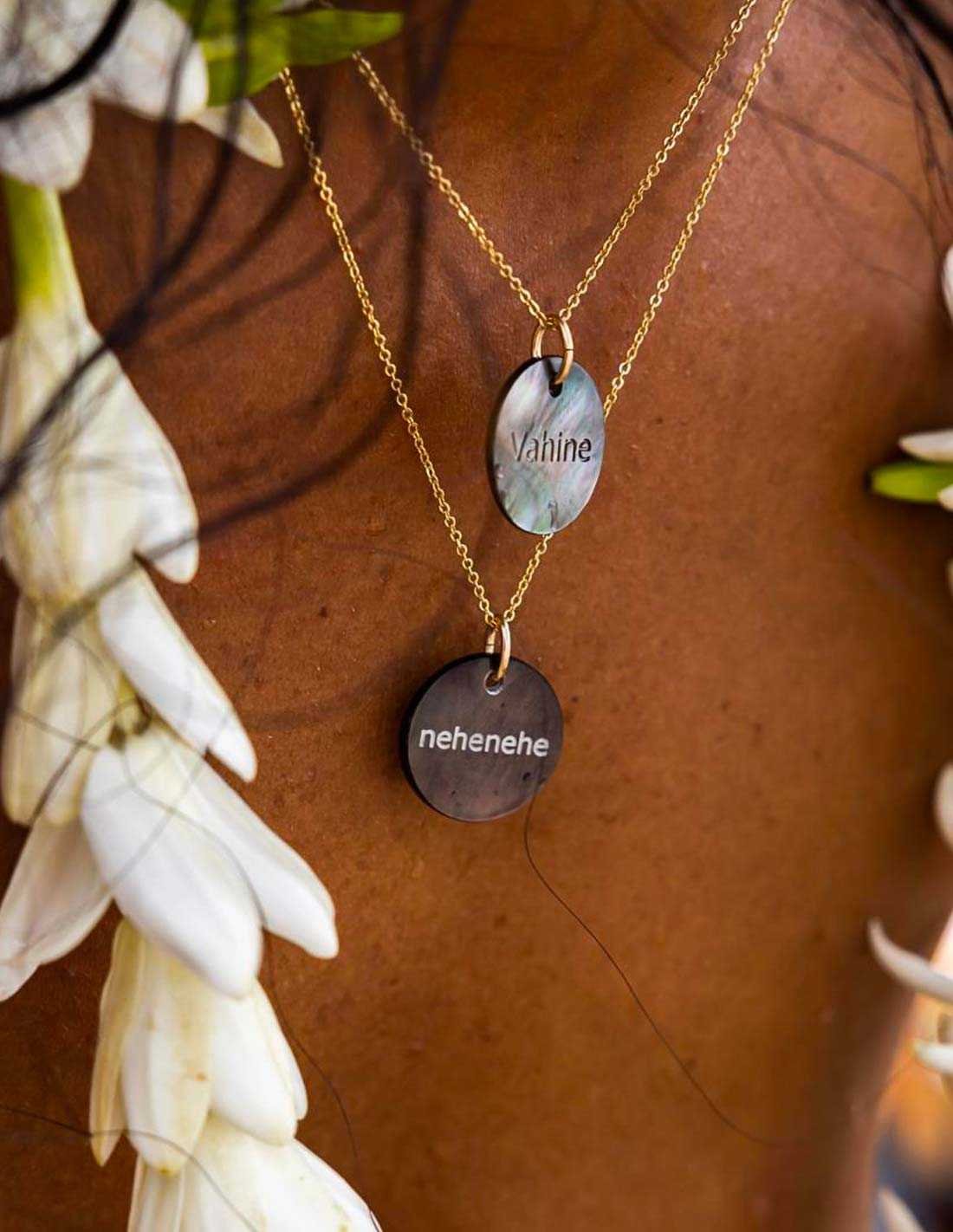 Médailles en nacre où sont gravés les expressions locales tahitiennes .