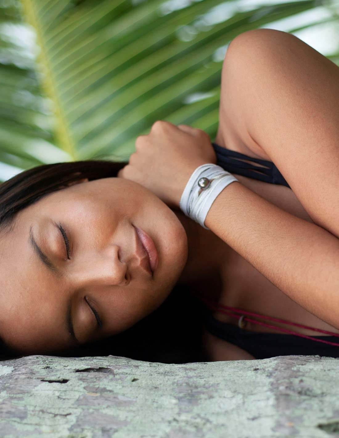 Avec une perle de Tahiti montée sur un ruban de soie à nouer sous le poignet.